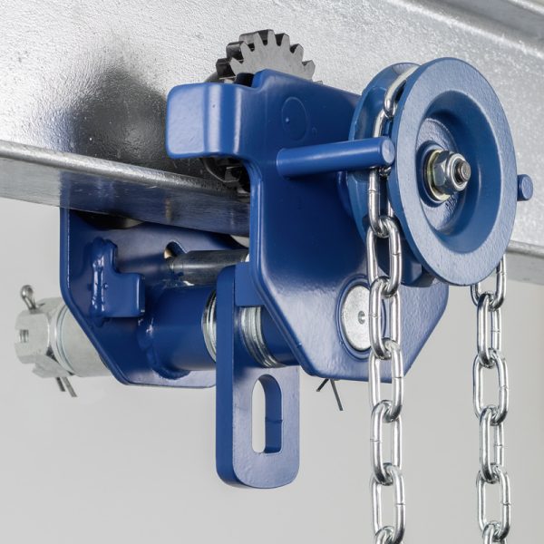 Manual trolleys are best suited for lighter cost effective jobs. Where as the geared trolley system will move heavy loads easily with a hand chain, the chain transmission brings the power to the wheels; meanwhile the load is balanced on four wheels. PLM-II chain hoists with the same capacity rating can be attached to the trolley. The hand chains are zinc coated for long life. You mount the trolley simply by pushing it on the open girder without disassembling of the unit.