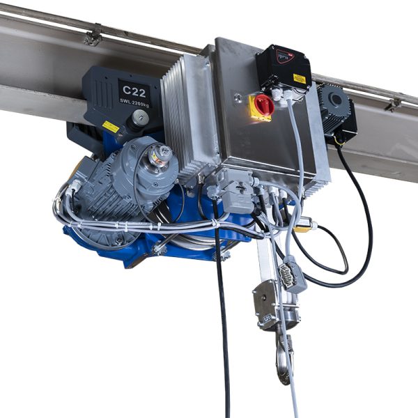 Ordinary electric hoists do not meet standards which are required in processes such as pharmaceutical, medical and semi-conductor production areas.Contamination due to particles coming from equipment around the production lines may result in bad products. Companies from these industries use enormous air cleaning and conditioning systems to ensure the lowest possible particle count in their production facilities.