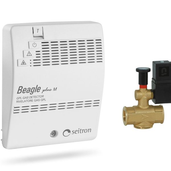 Kit including a Beagle LPG gas detector with 230V~ power supply and cut-off valve EVGPAFM020 N.O. 230V or EVGPCFM020 N.C. 230V, both featuring manual reset, 2 x 3/4” to 1/2” nipples.