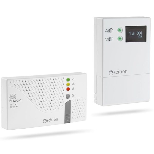 Microprocessor based domestic gas leak detector Segugio (available for methane or LPG gas) equipped with a wireless radio transmitter DRG01M that control the electro valve. Mute and test functions. Precalibrated sensor, directly replaceable by user.
